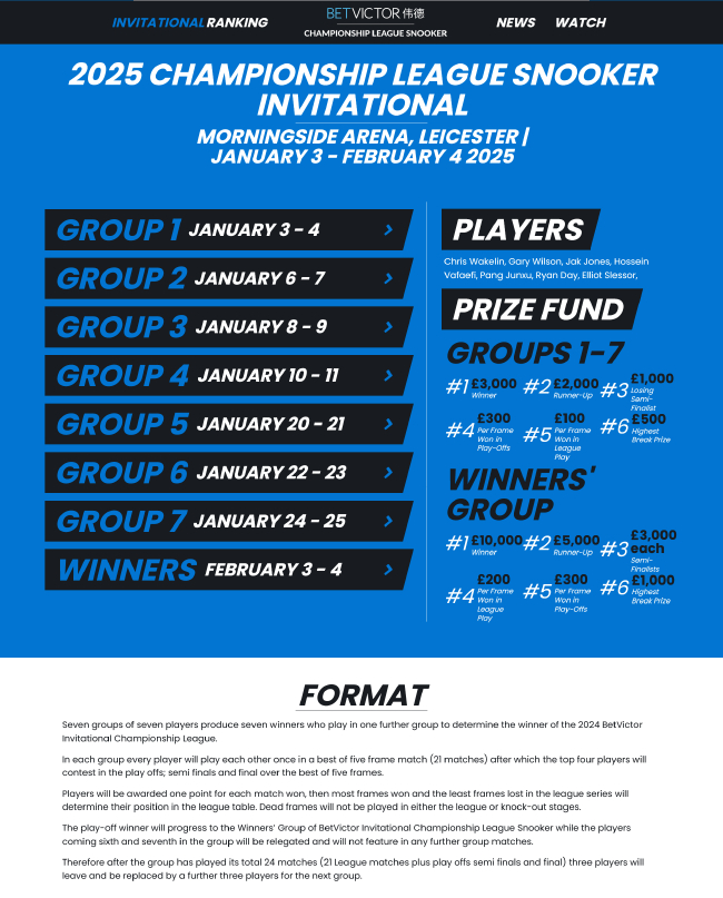2025斯诺克冠军联赛(邀请赛版本)的比赛共分为4个时间段进行,2025年1月3-4日进行第1小组的第组比赛,1月6-11日进行第2-4小组的比赛,1月20-25日进行第5-7小组的比赛,2月3-4日进行冠军组、即7个小组冠军之间的最终决赛。